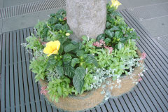 『ケヤキの美しさを邪魔しない!』をメインに、ハイビスカス(黄色)・ブルーサルビア・ヘリクリサムを使って足元にミニ花壇を制作しましたが、雨の多い天候と日照不足でハイビスカスが咲き揃わなかったのが少し残念でした。