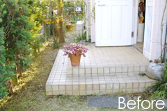 ヒバの生垣に囲まれ門から玄関までのアプローチが暗い印象になってしまっていました。お子様が成長・独立されてご夫婦での第二の人生を送られており、老後も視野に入れてのガーデンリフォームをしたいとの事でしたので、玄関前の高さのあるステップの改善や出来るだけローメンテ(雑草の処理など)を考慮に入れてデザインしました。